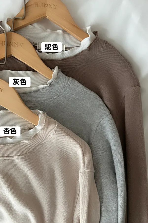 B12915 優雅的發熱小花邊雙色刷毛衣 杏 現貨*T