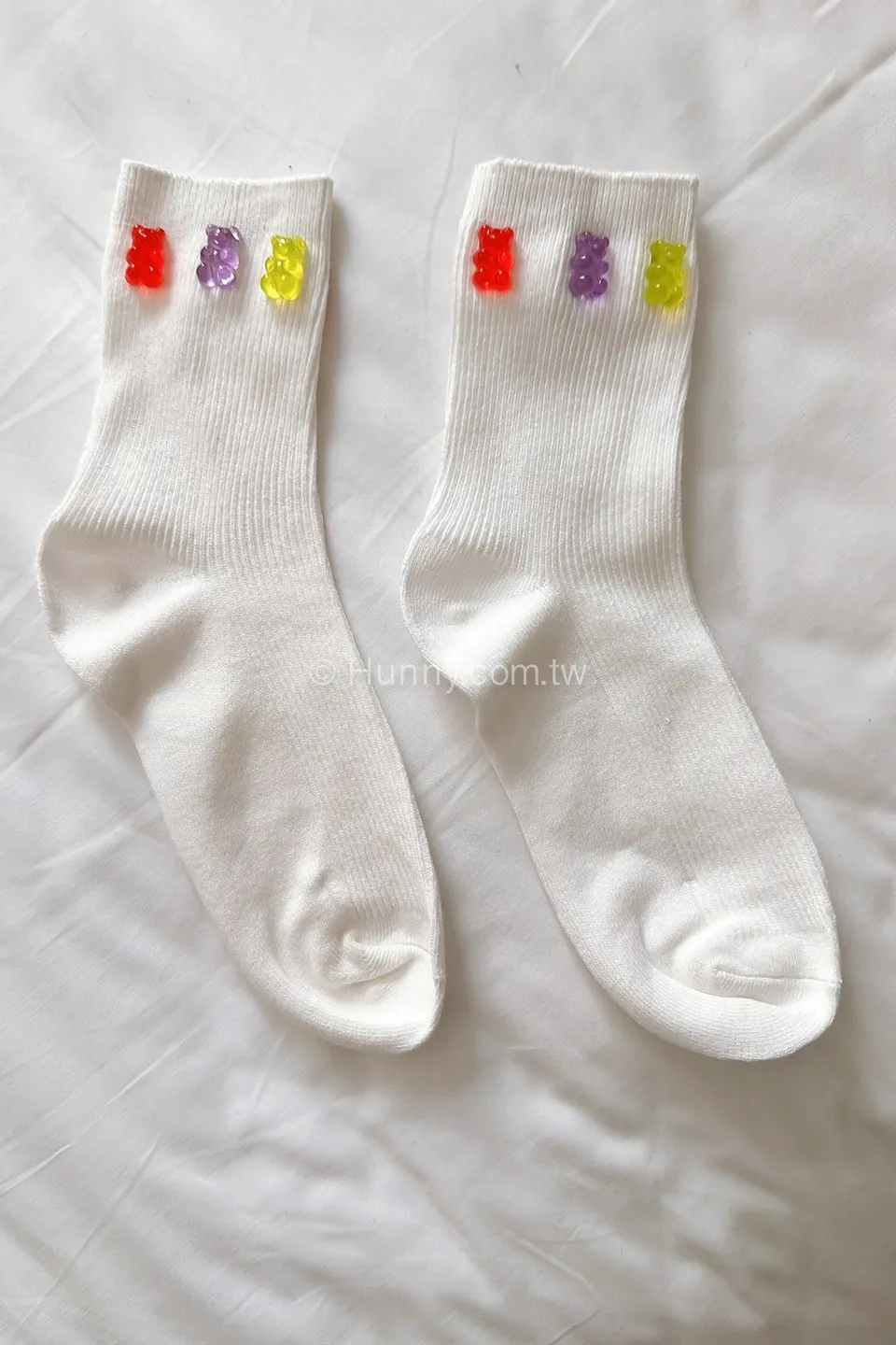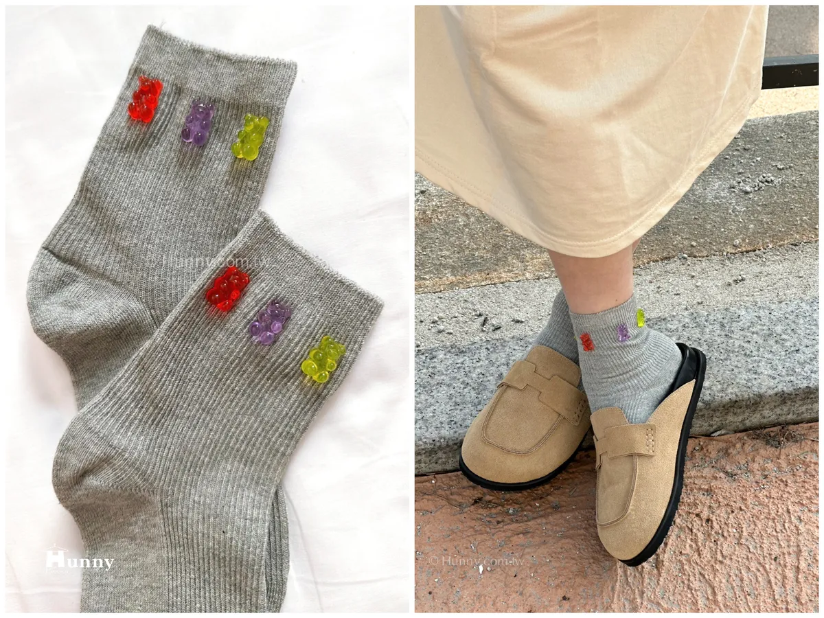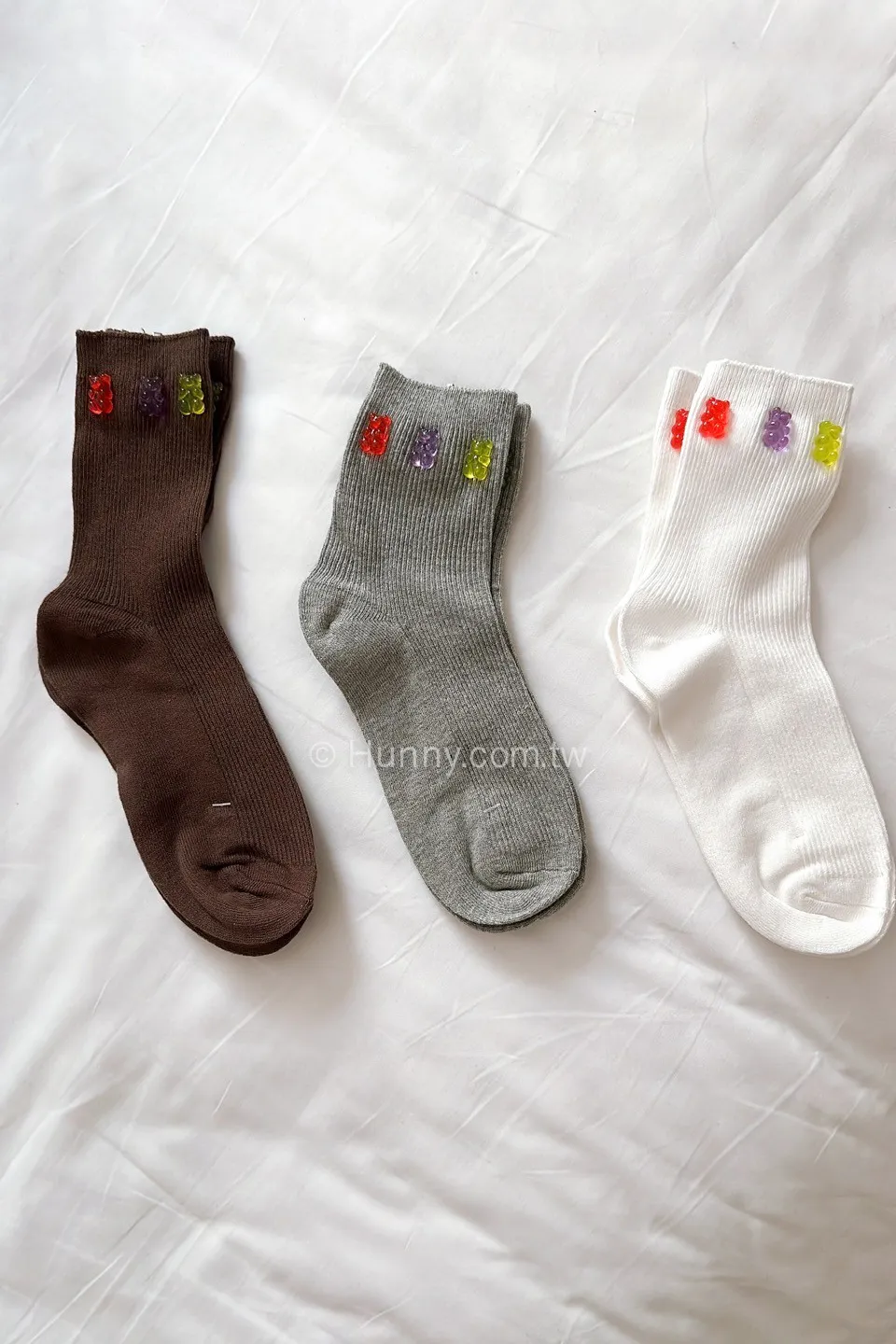 KR31233 超立體彩色小熊軟糖坑條襪 白/灰/咖