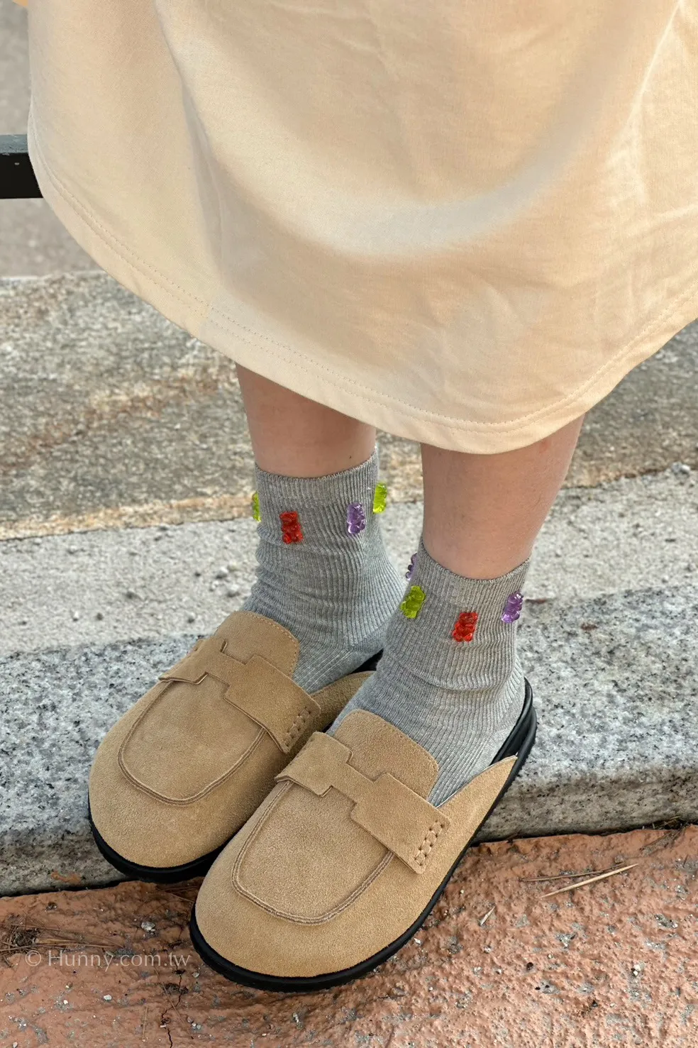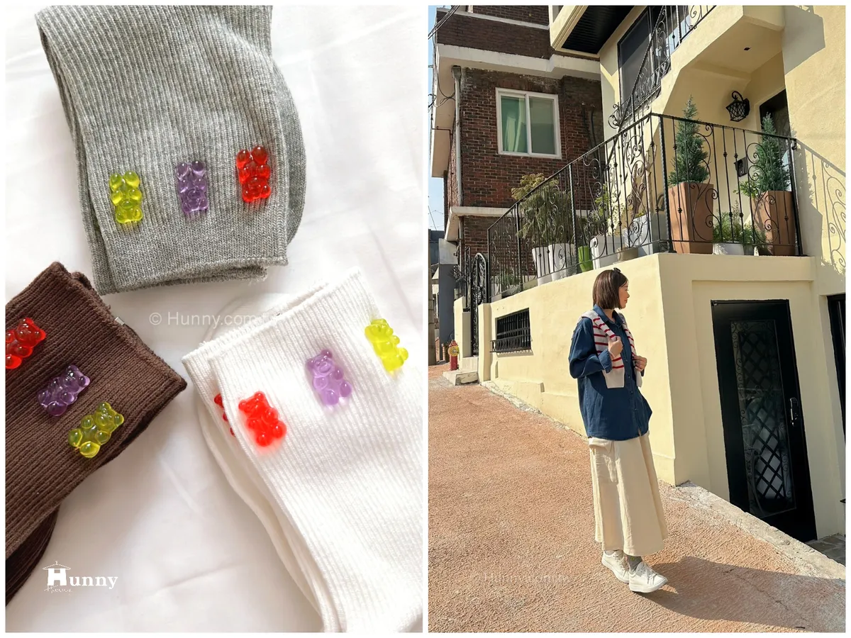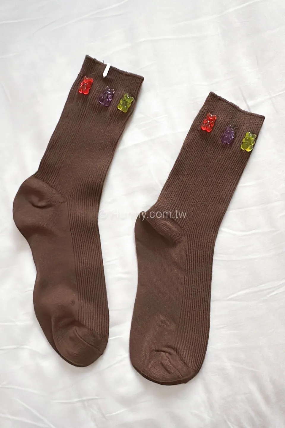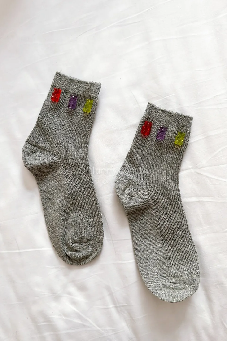 KR31233 超立體彩色小熊軟糖坑條襪 白/灰/咖