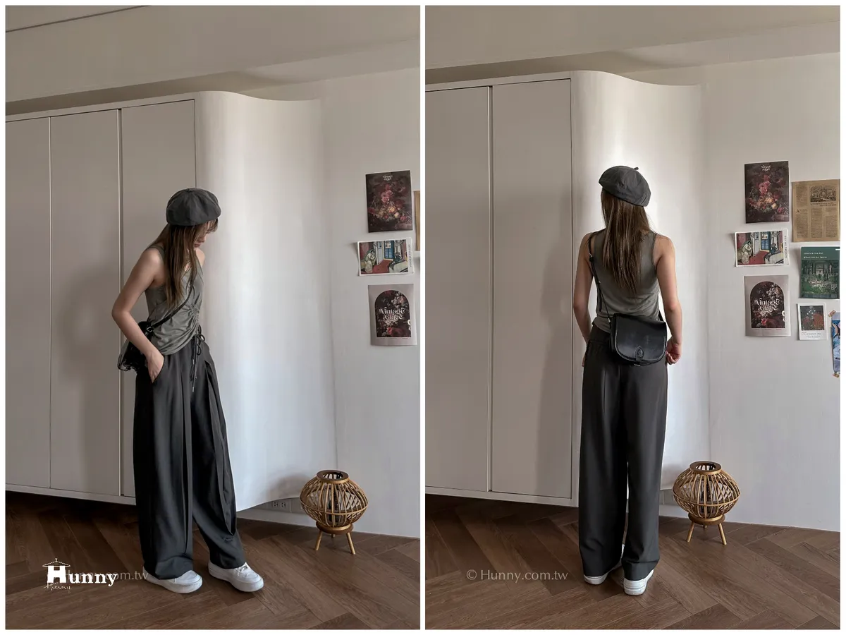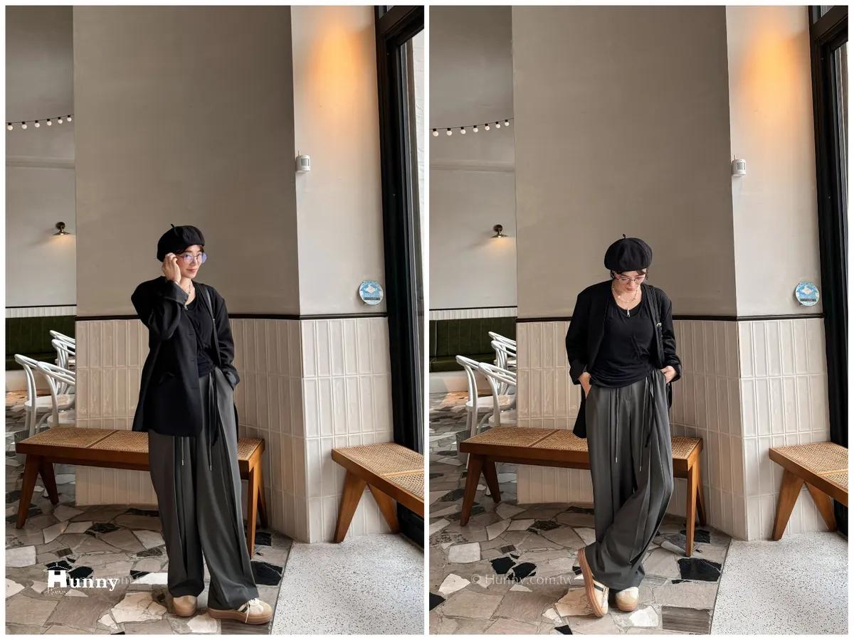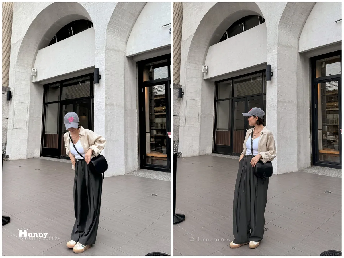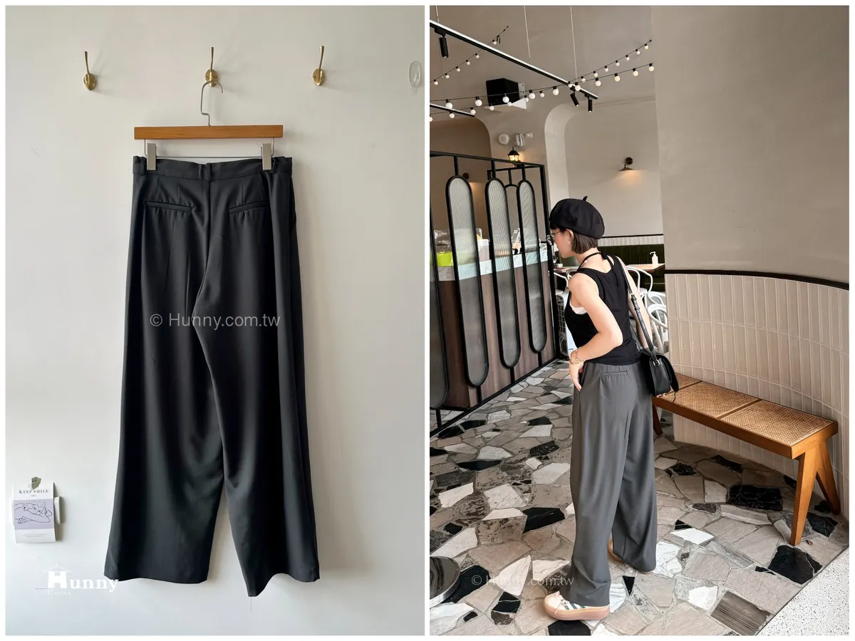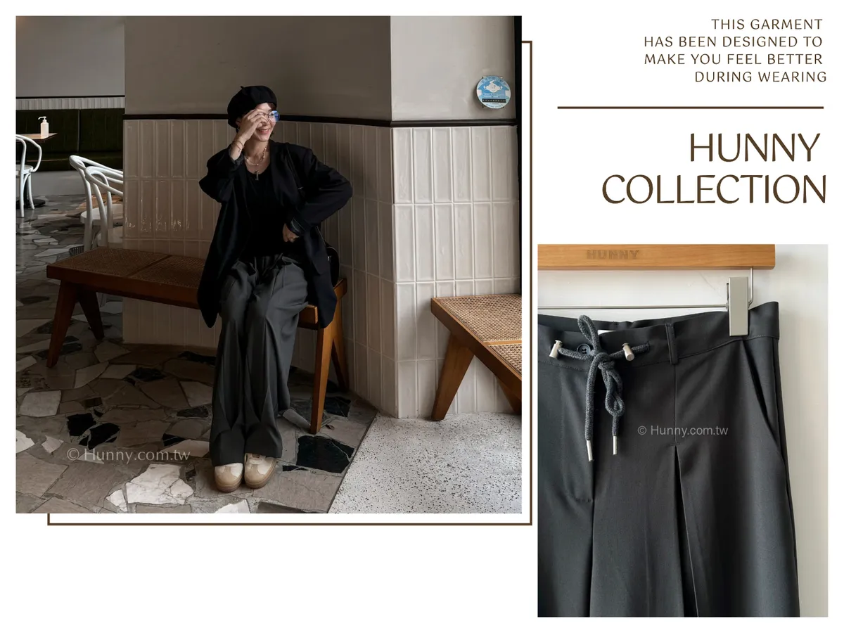 外觀看起來是正式的西裝寬褲,但有加上抽繩的關係讓它也可以走微休閒的風格~