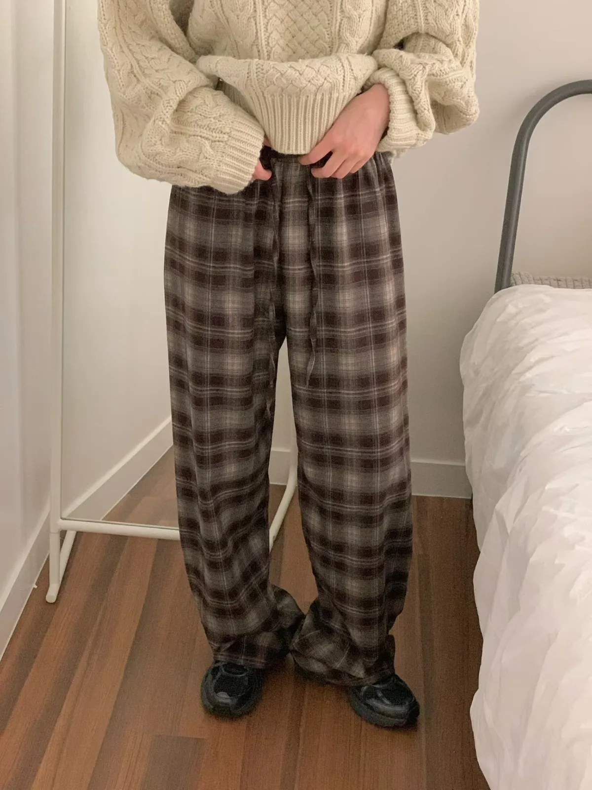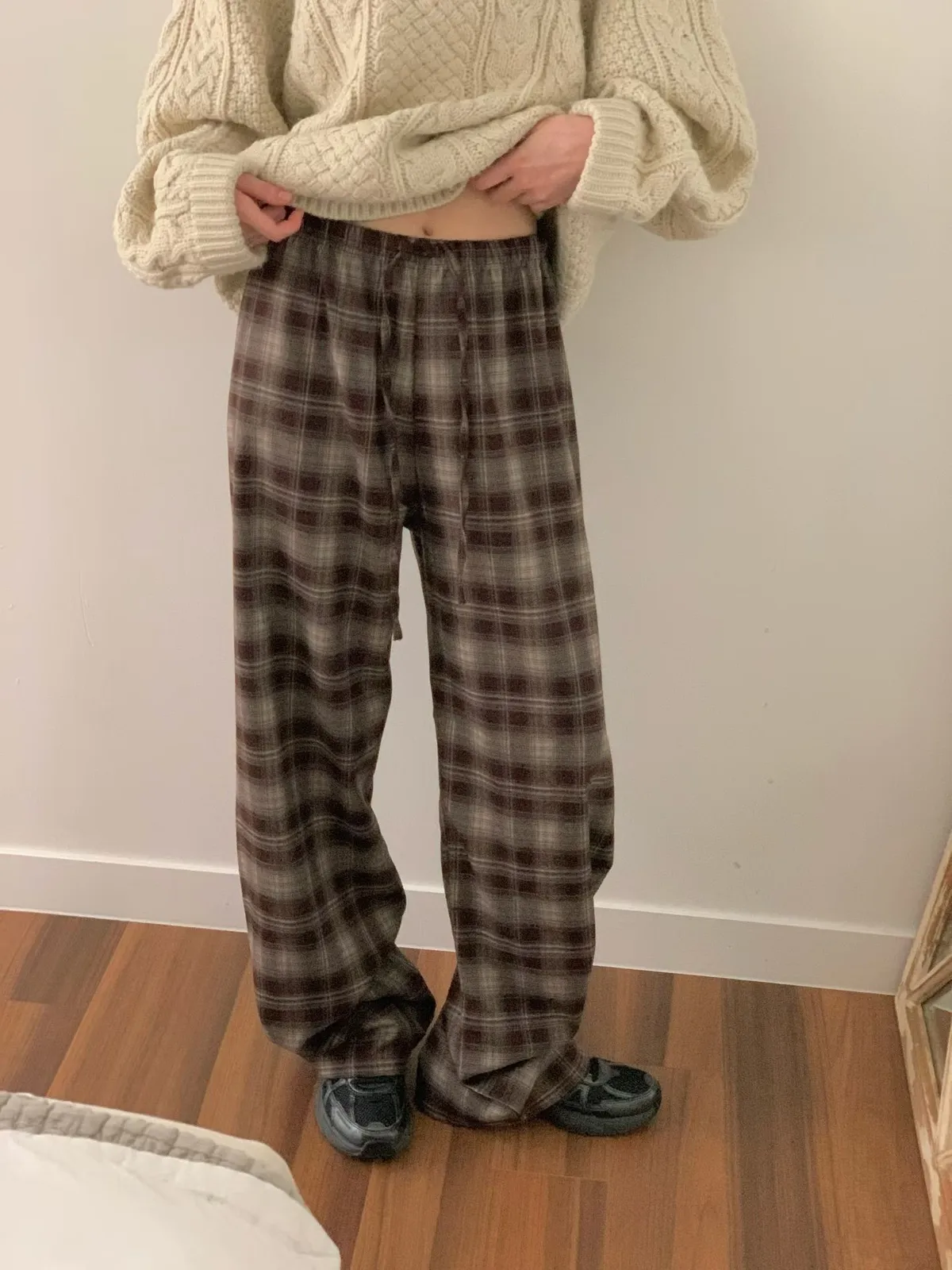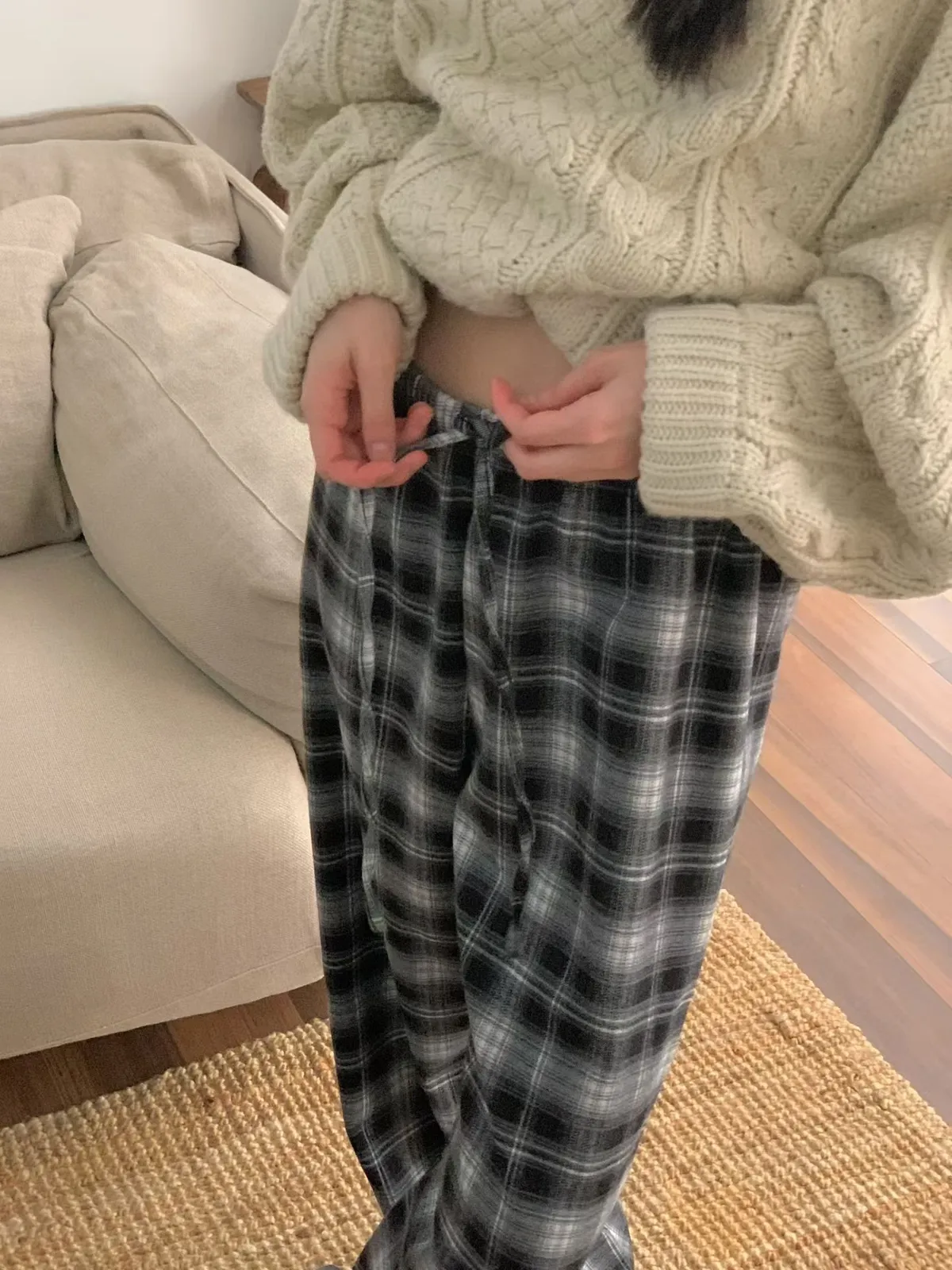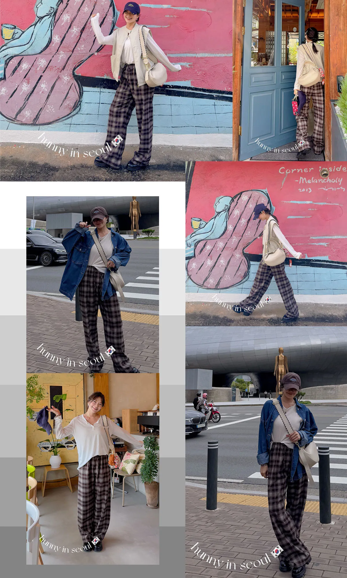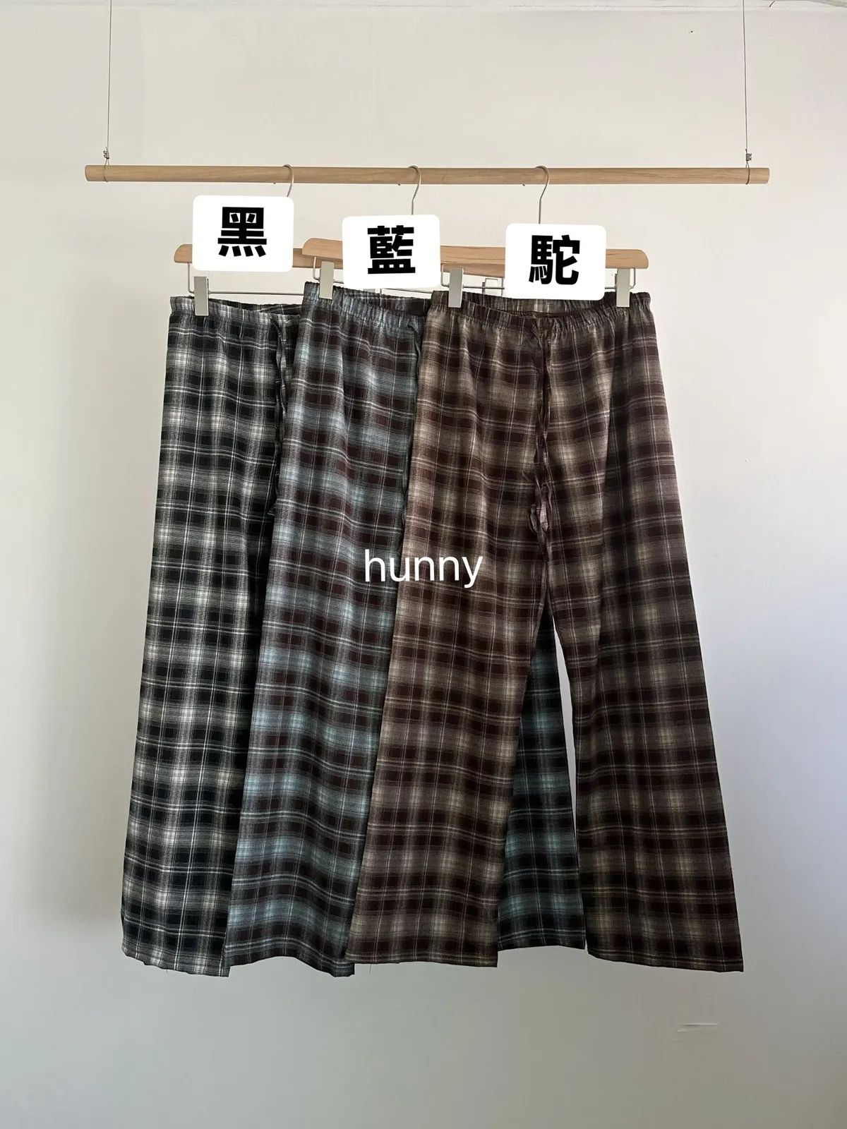 Sp21 慵懶小女人磨毛格紋寬褲 藍現貨