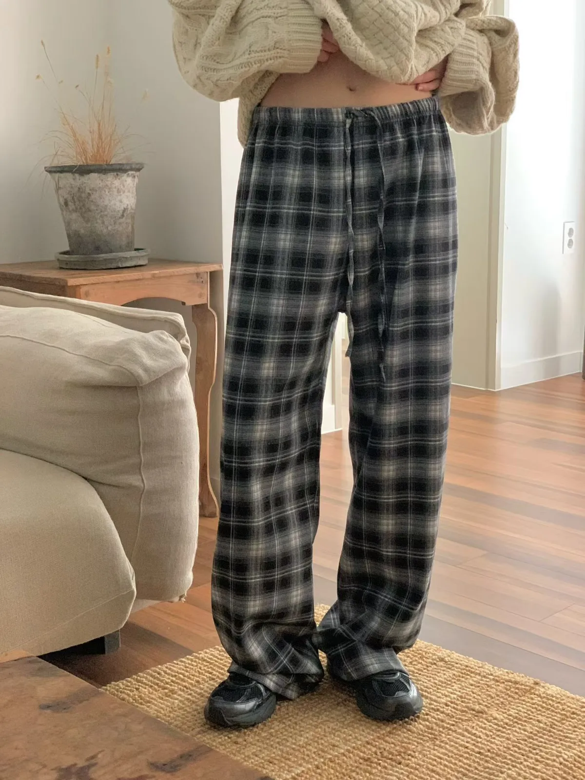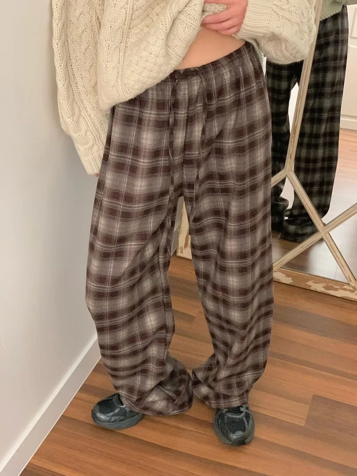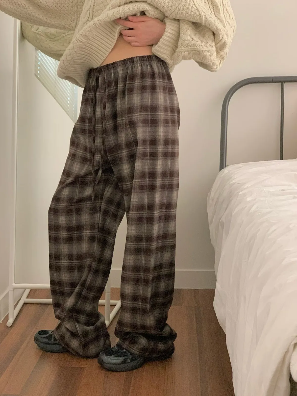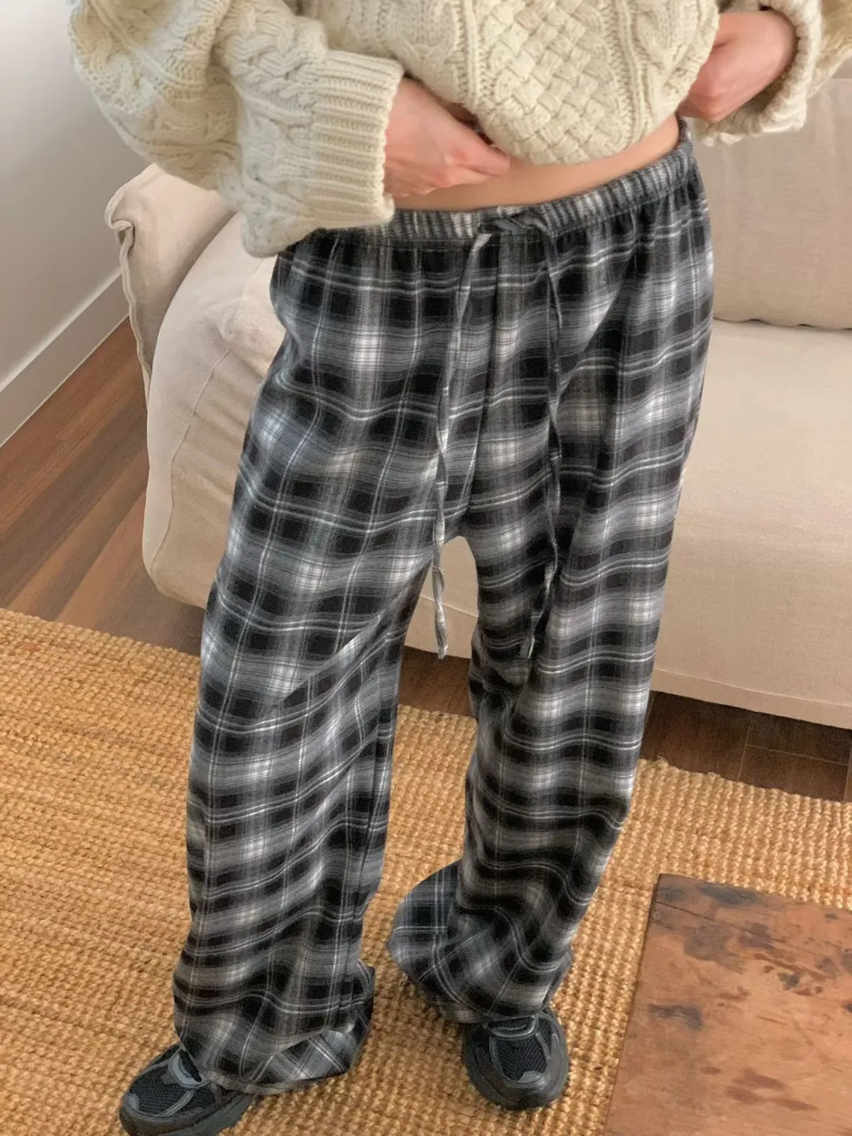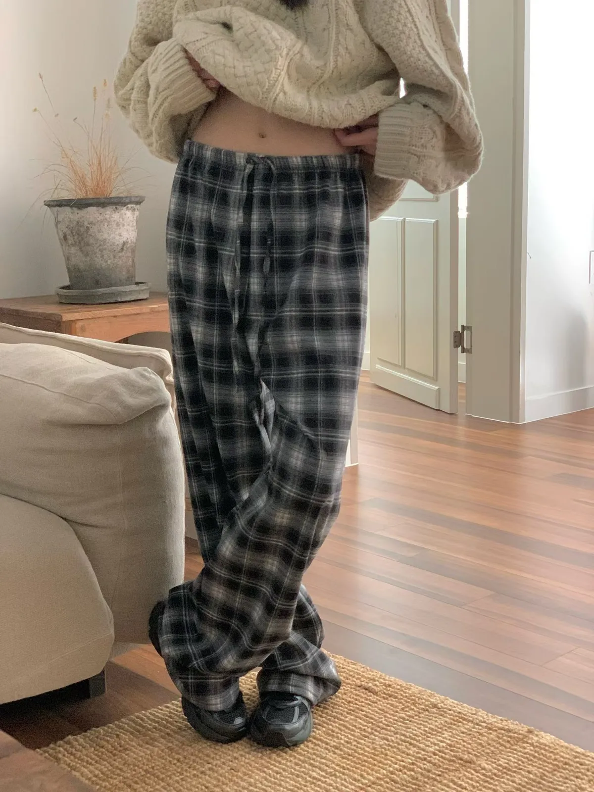 Sp21 慵懶小女人磨毛格紋寬褲 藍現貨