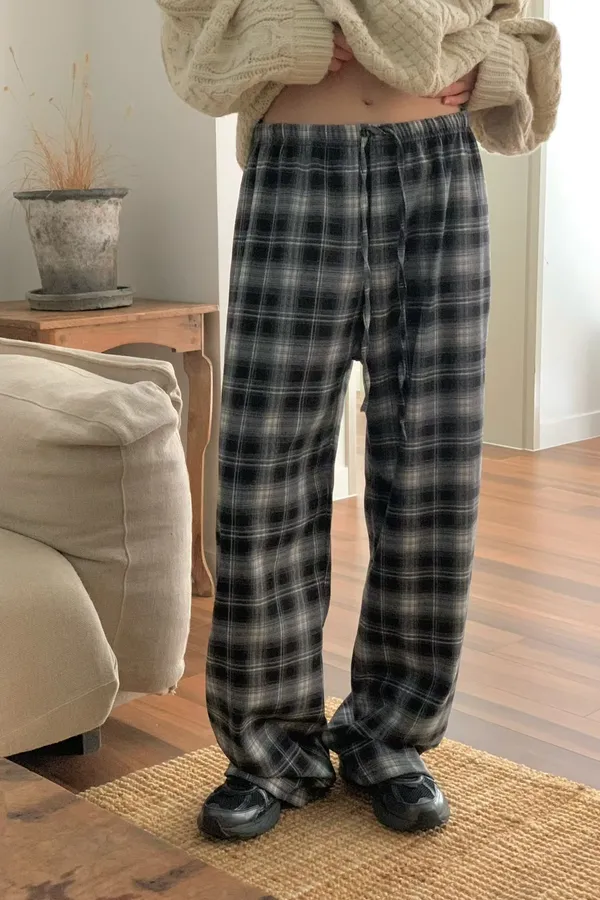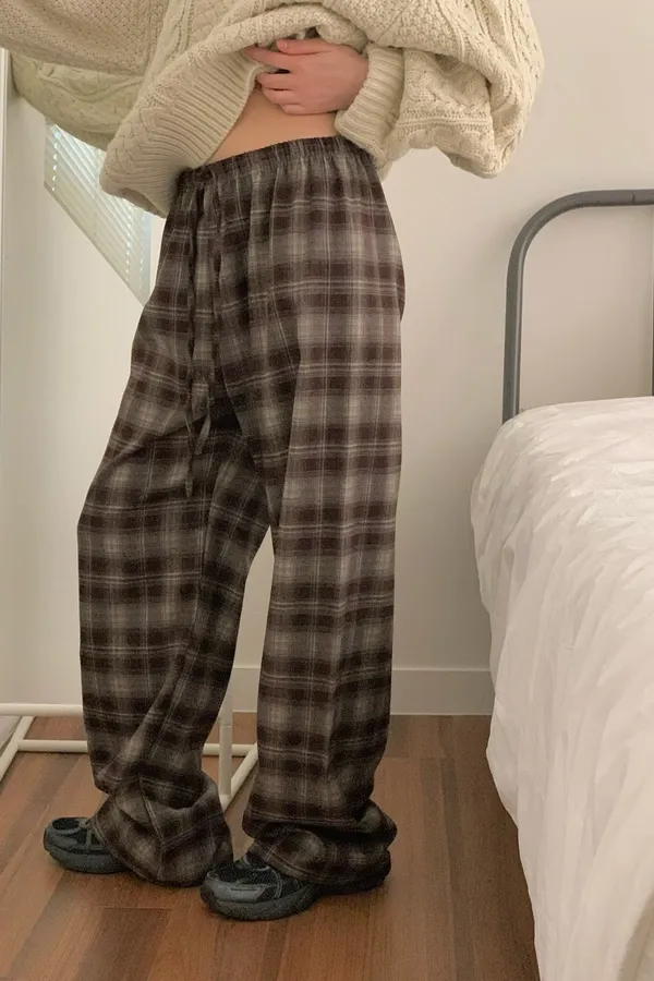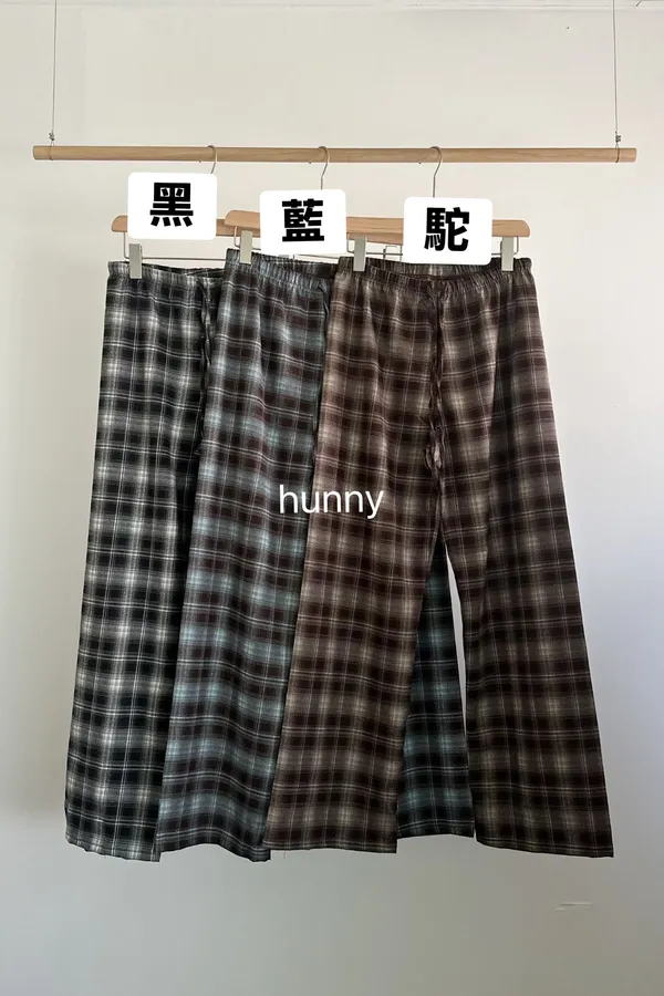 Sp21 慵懶小女人磨毛格紋寬褲 黑藍駝