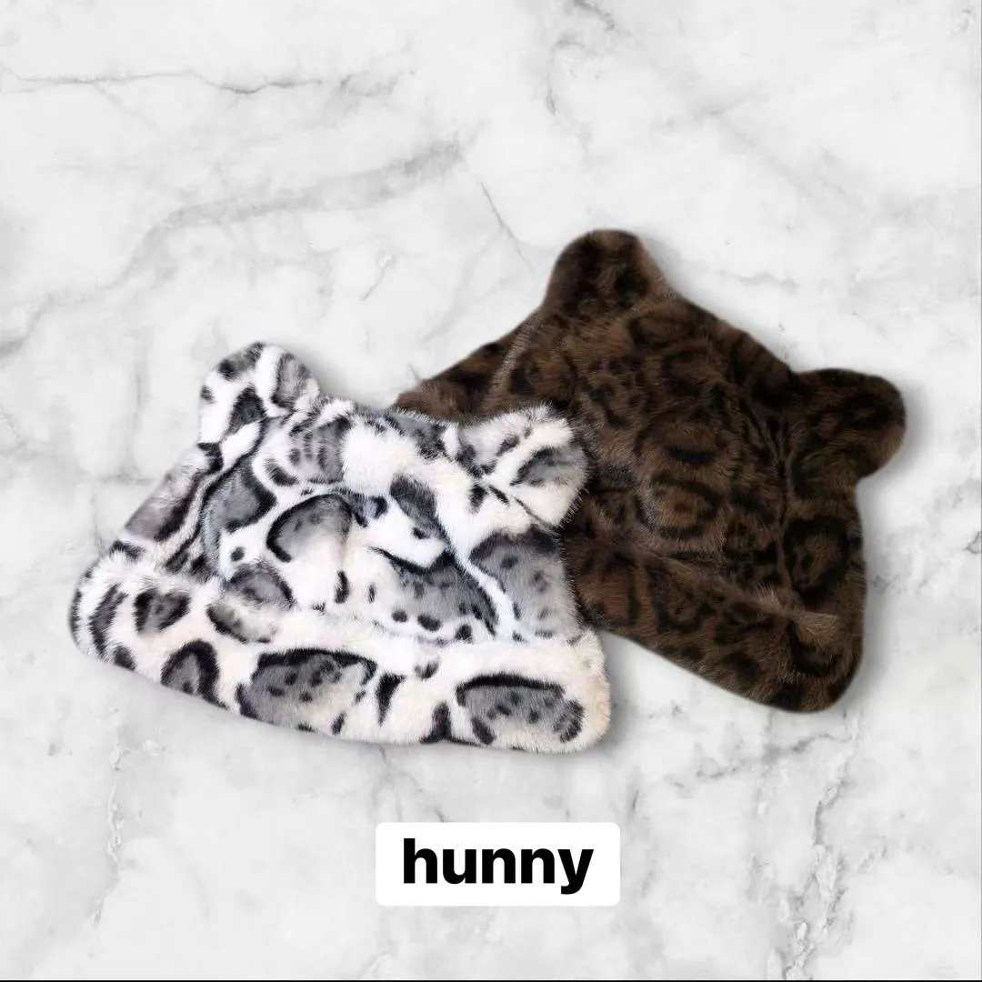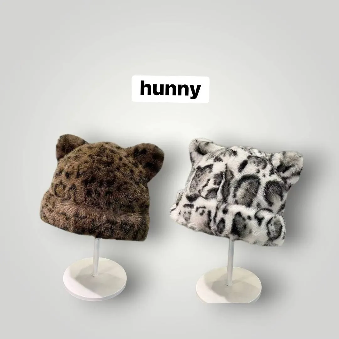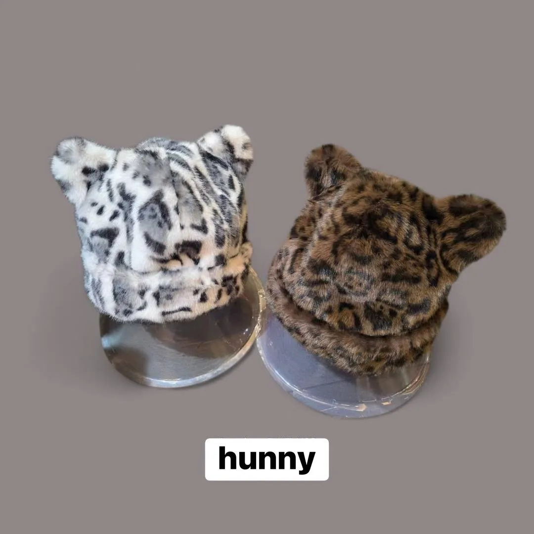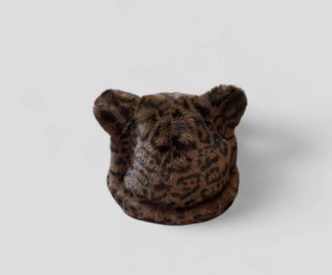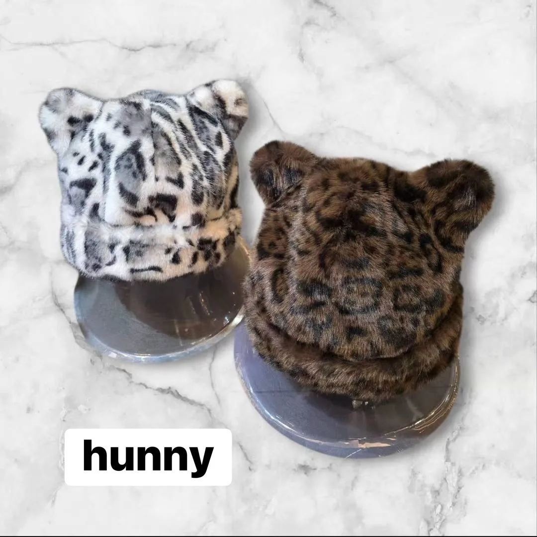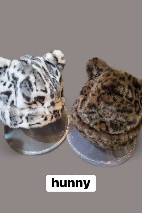 a112816 可愛爆擊貓耳豹紋麂皮盆帽 咖/白